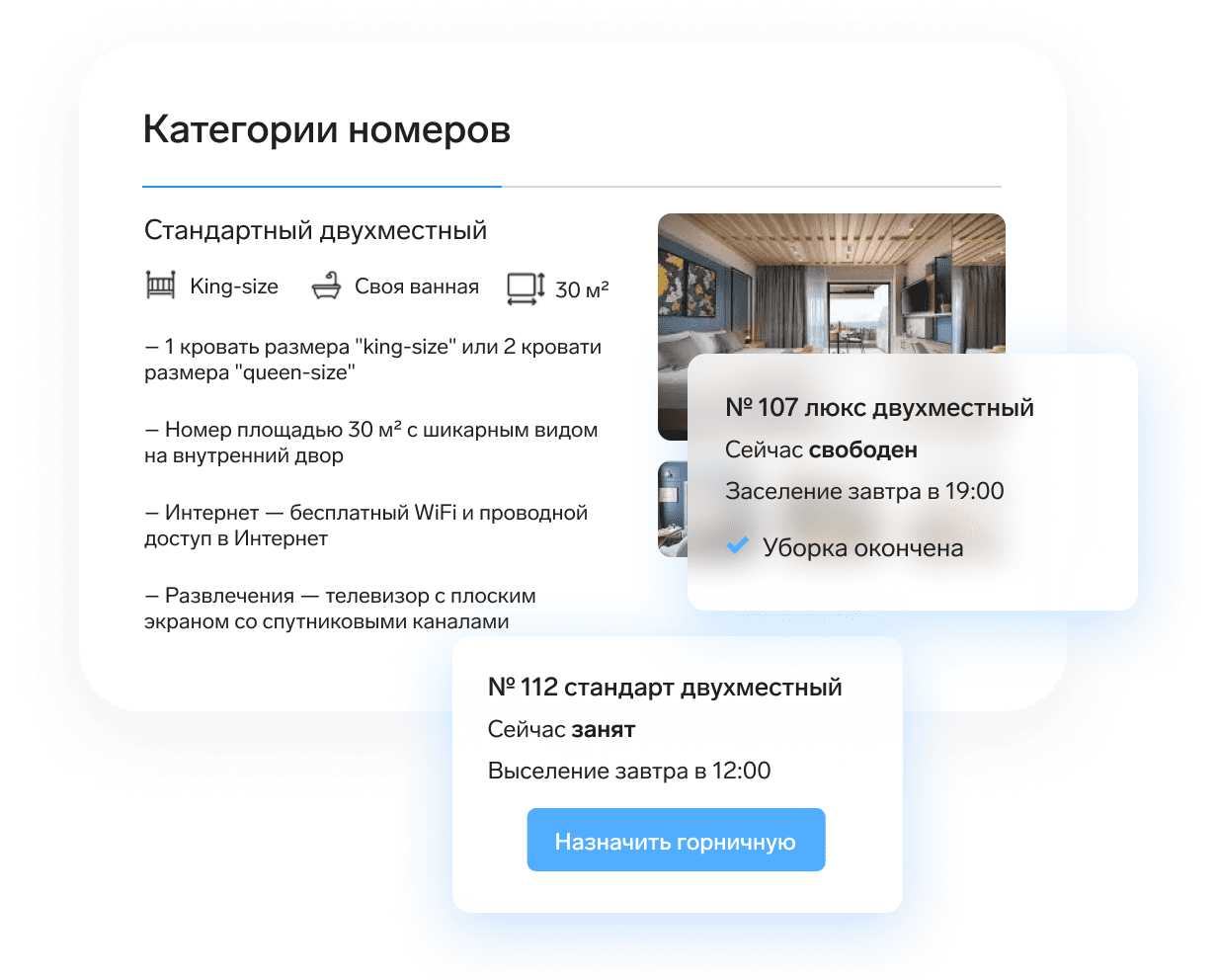 •Управляйте расписанием уборок и распределяйте задания среди горничных