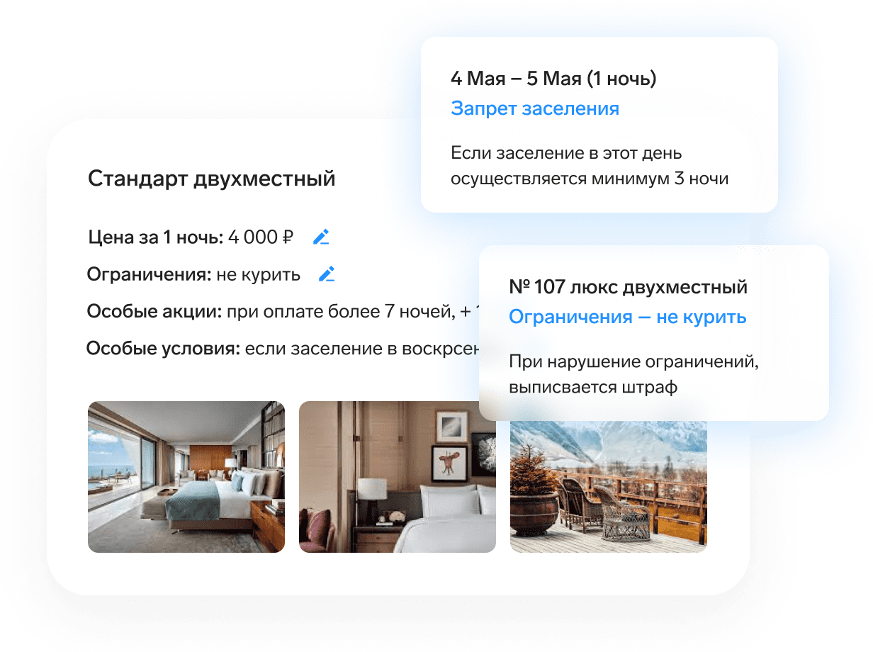 • Добавляйте фото, описания номеров и дополнительных услуг, которые клиенты увидят на сайтах бронирования
